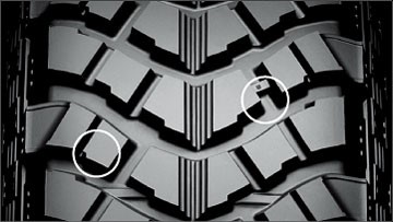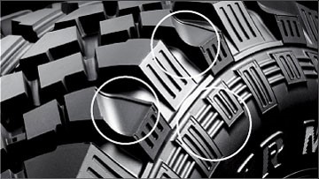 - แถบยางคู่ที่แก้มยางได้รับการพัฒนาเพื่อป้องกันการทิ่มตำจากของมีคม ขณะวิ่งลุยบนถนนออฟโรด
