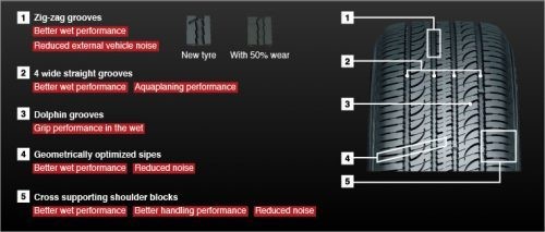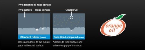 เนื้อยางที่มีส่วนผสมของ “โพลิเมอร์ผสม” (Polymer Blend) ช่วยลดความต้านทานการหมุน เพิ่มความแข็งแกร่งให้กับเนื้อยางและมีน้ำมันส้มเป็นส่วนประกอบทำให้ประสิทธิภาพในการยึดเกาะถนนเพิ่มมากขึ้น